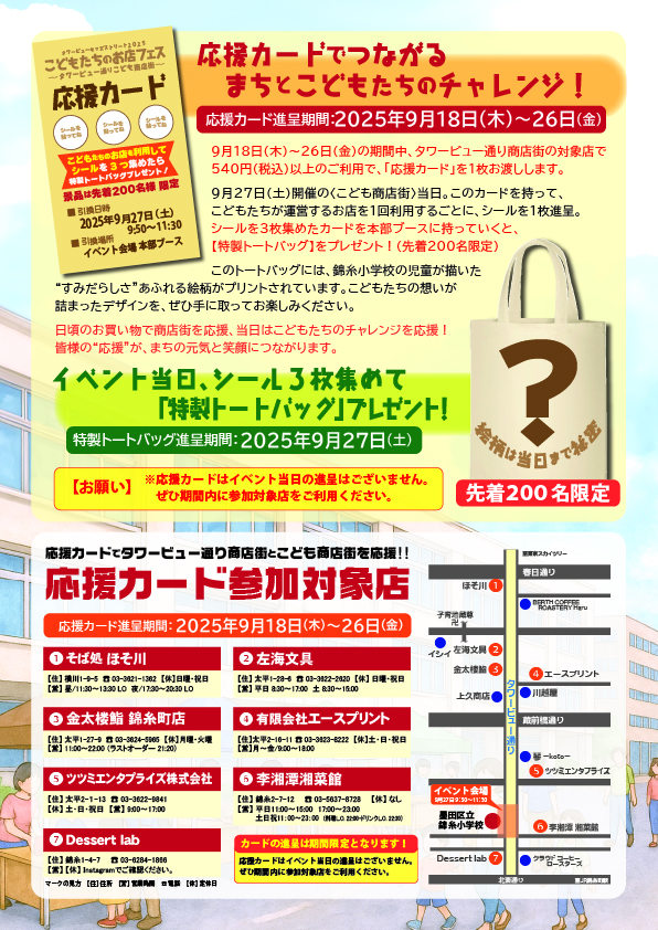 応援セール期間中、タワービュー通り商店街の対象店で540円(税込)以上のご利用で、「応援カード」を1枚お渡しします。